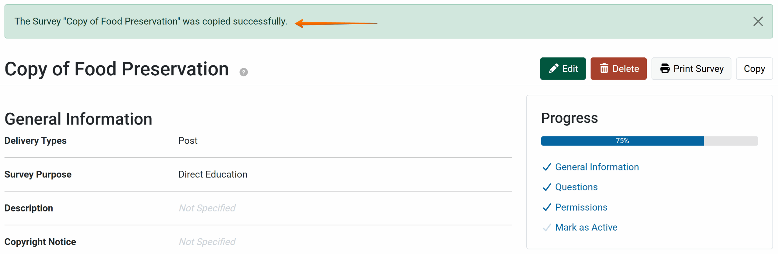 The details of the survey copy display, and an alert message confirms the copy was successful.
