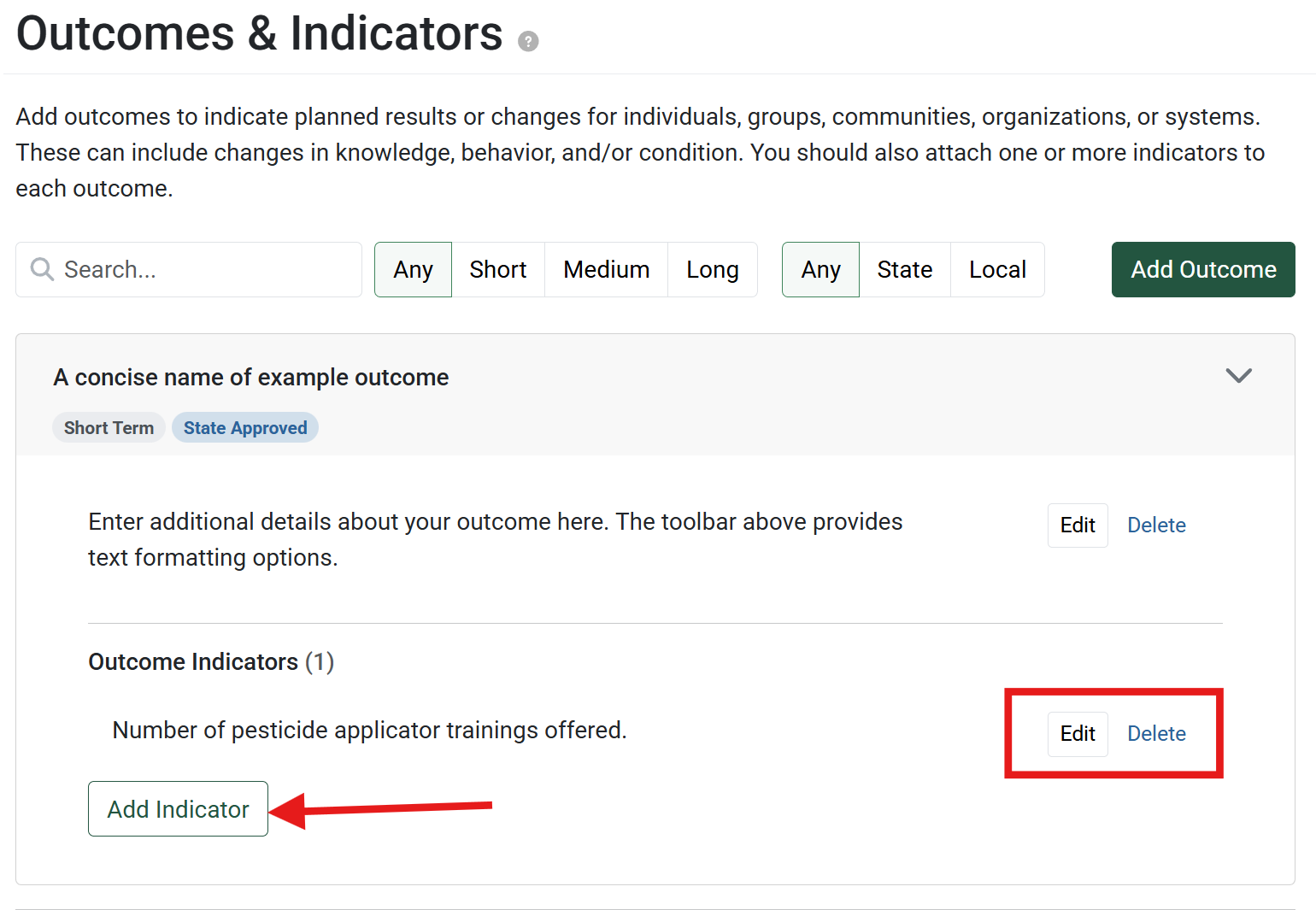 - Once your indicator has been added, it will display below the outcome. If needed, you may edit or delete the indicator from here. Repeat using the “Add Indicator” button until all indicators have been included.