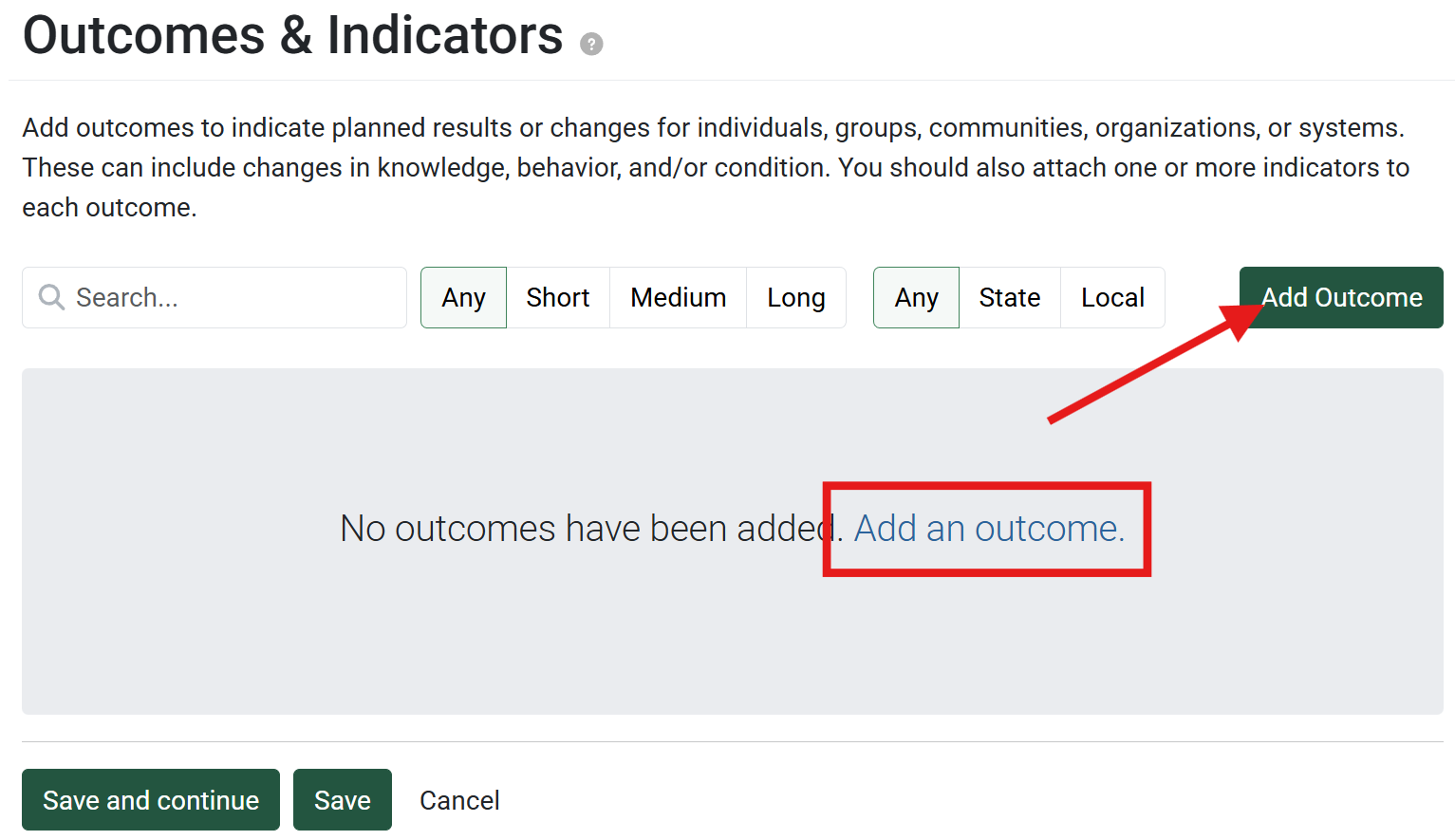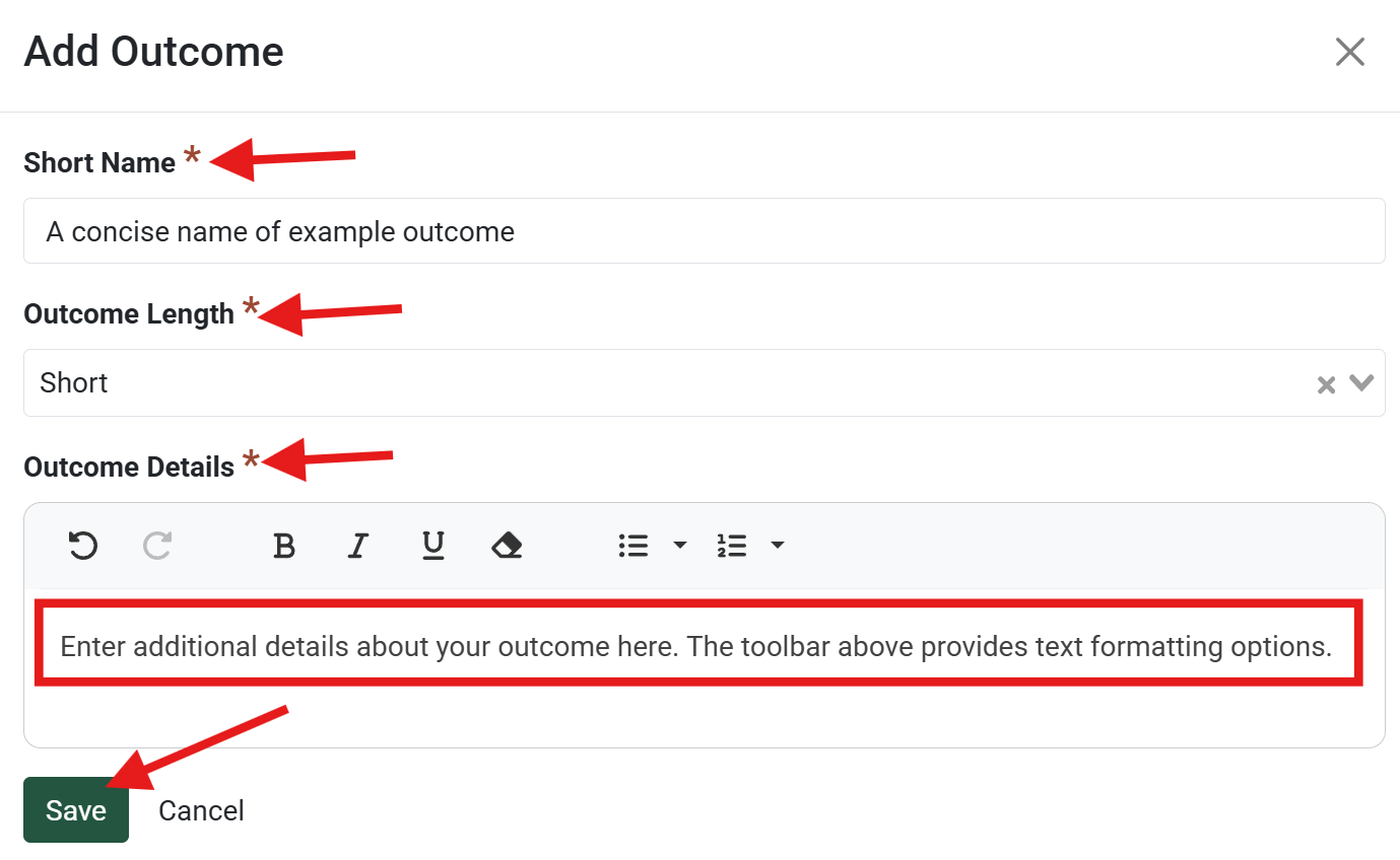 - A text box displays with three required fields: Short Name, Outcome Length (choose between short, medium, and long term in the drop-down), and Outcome Details. Enter your data into each of the required fields and click Save.