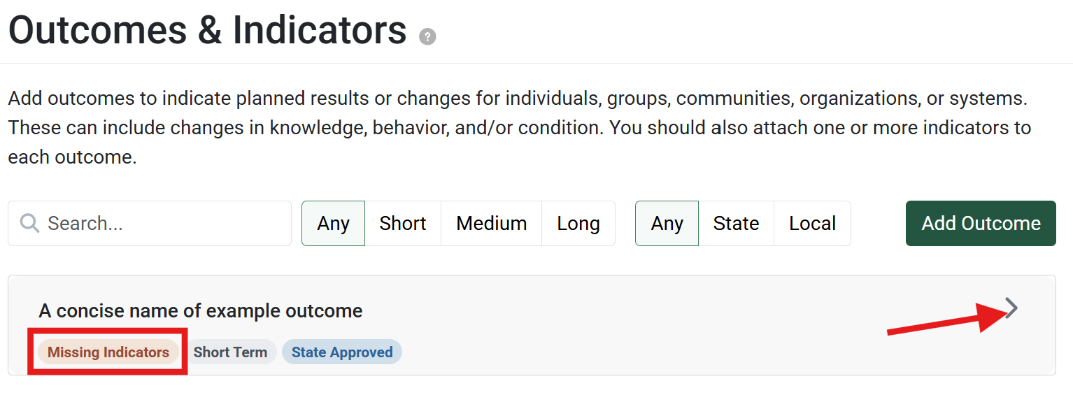 - Once saved, the outcome displays the Short Name and length. It will also display a “Missing Indicators” label. Click the arrow on the right side of the outcome to expand more details.