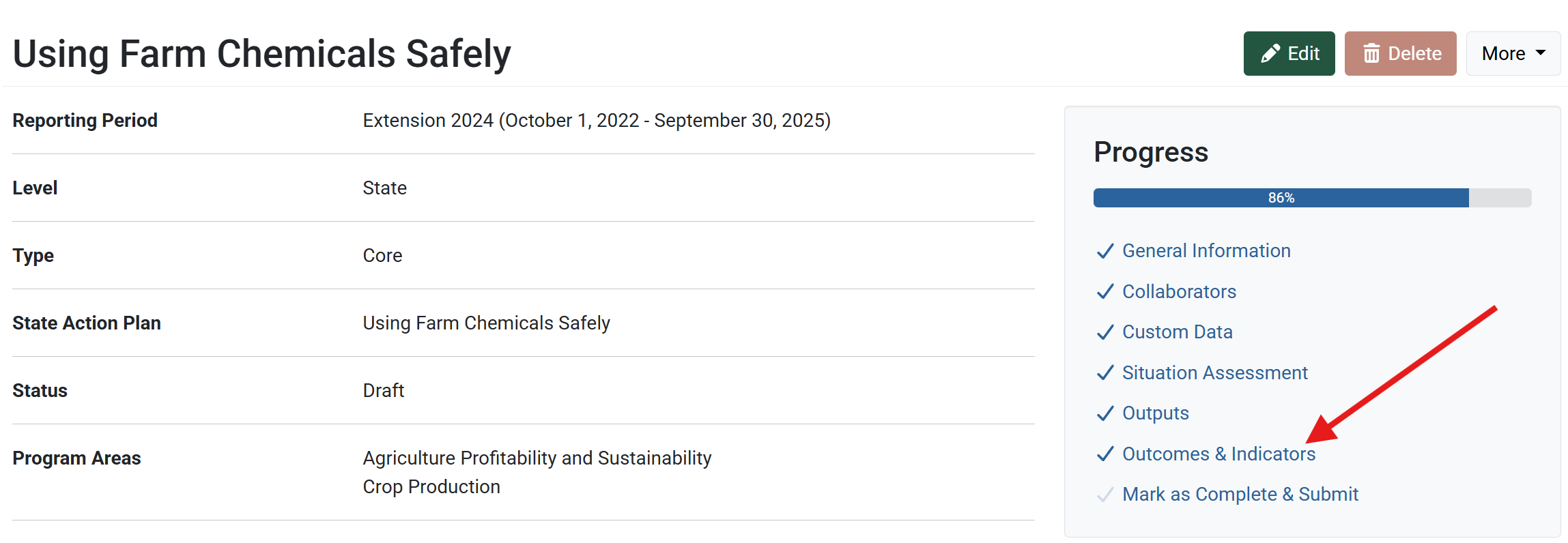 If the Action Plan being created was copied from a state-level plan, the Outcomes and Indicators from the state-level plan will be listed here. They can be deleted if needed.