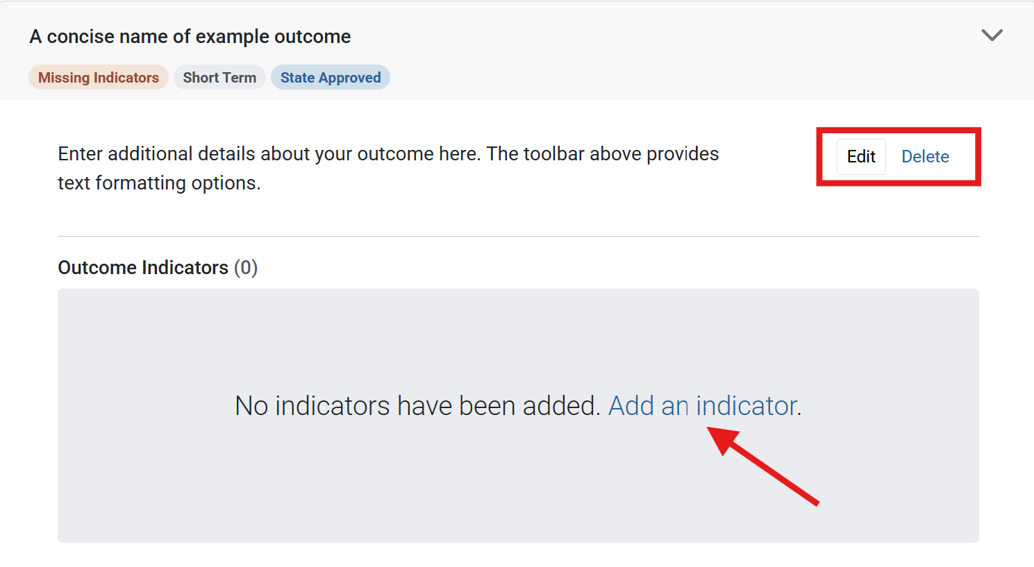 - To add an indicator of how the outcome will be measured, click “Add an Indicator“. The outcome can also be edited or deleted from within the expanded view.
