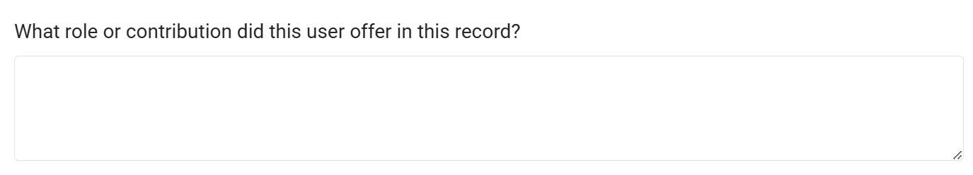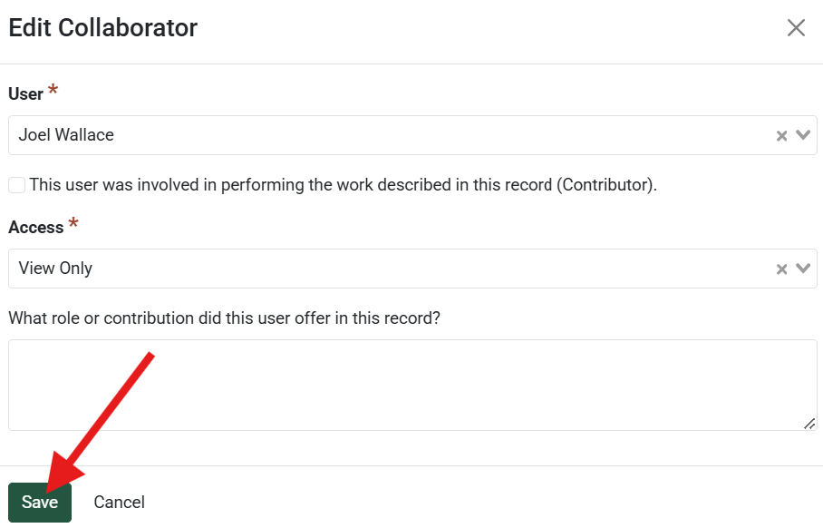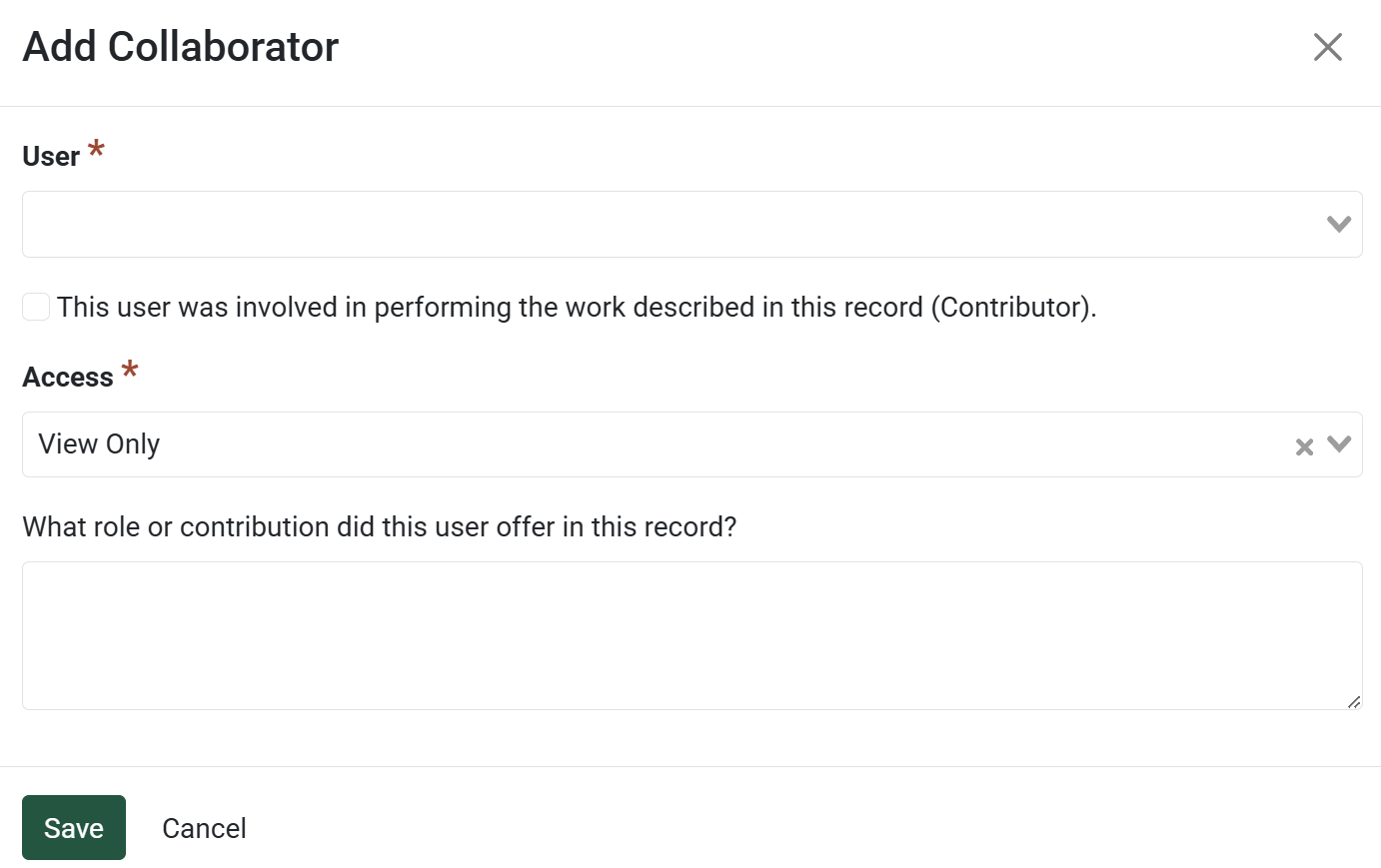Add a collaborator to allow other users to view or edit a record. Optionally, specify if other users were involved the work reported in the record and describe their contribution(s).