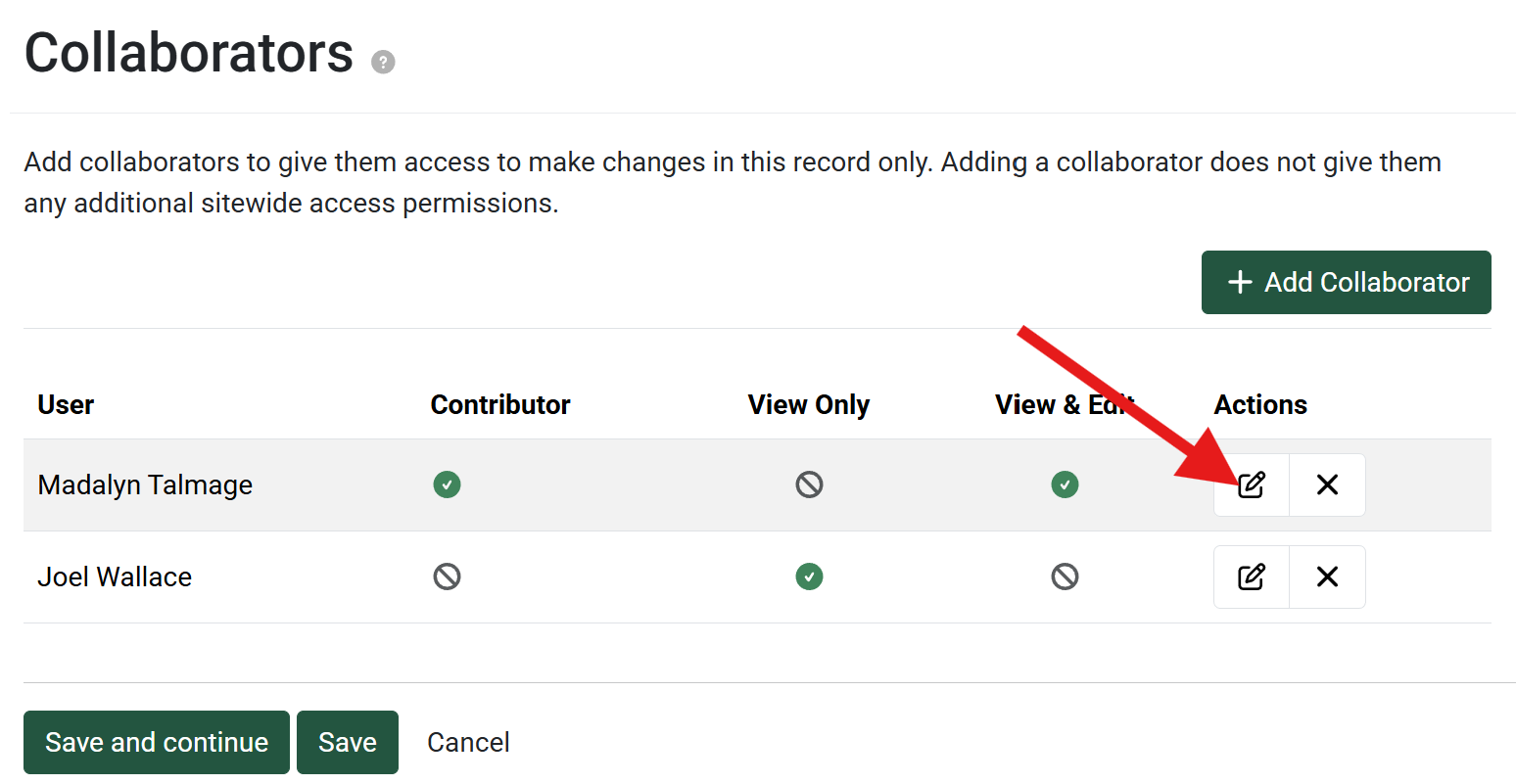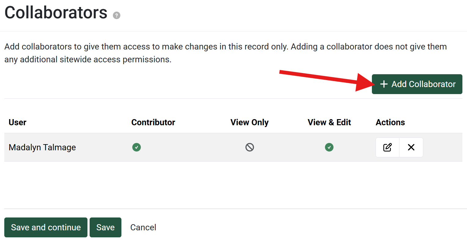 In the Collaborators section, the creator of a record can allow other users to view or edit the record. This section can also be used to give credit to other users who were involved and to describe their contribution.