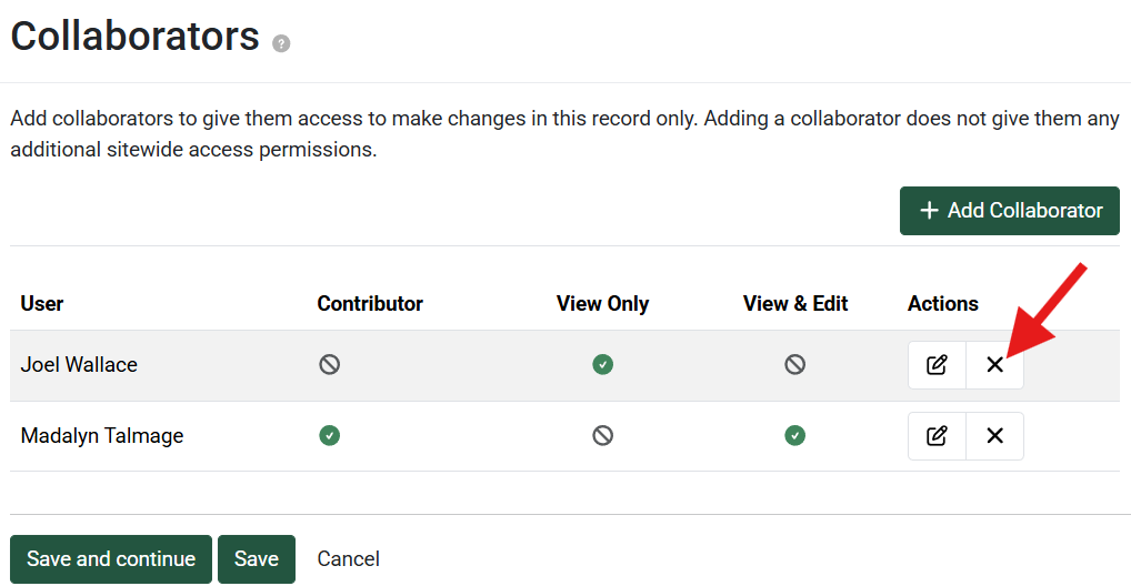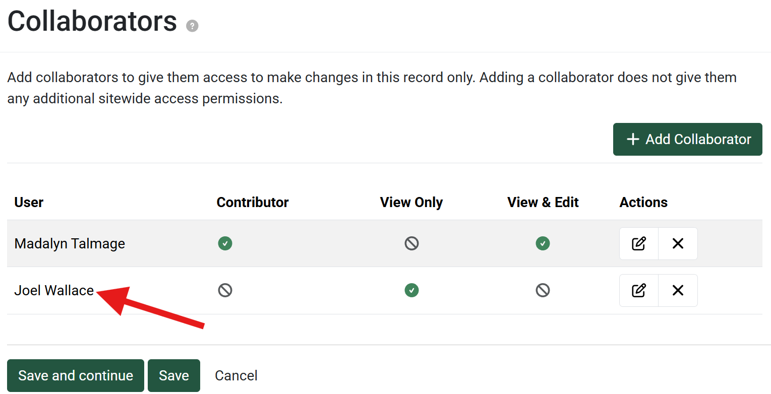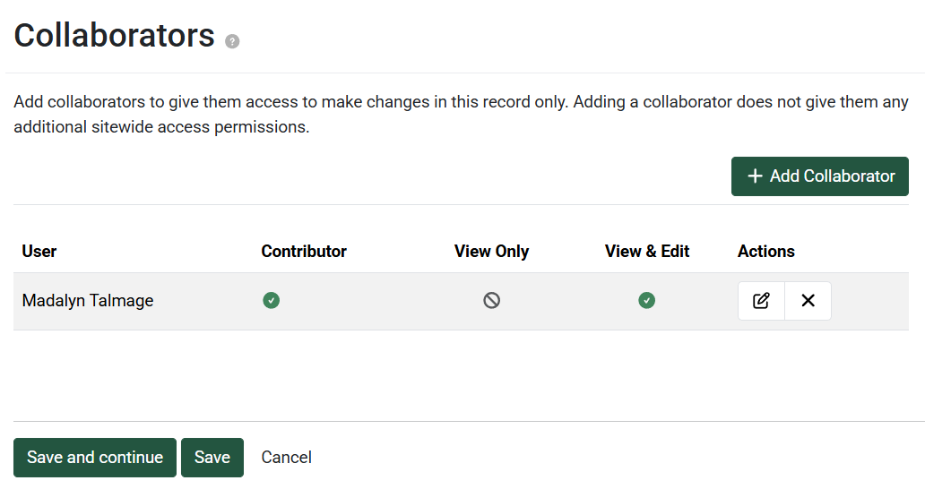 - The collaborator now appears in the list. Click Save and continue to save the page and move to the next section, or click Save to save the current changes and view the record details.