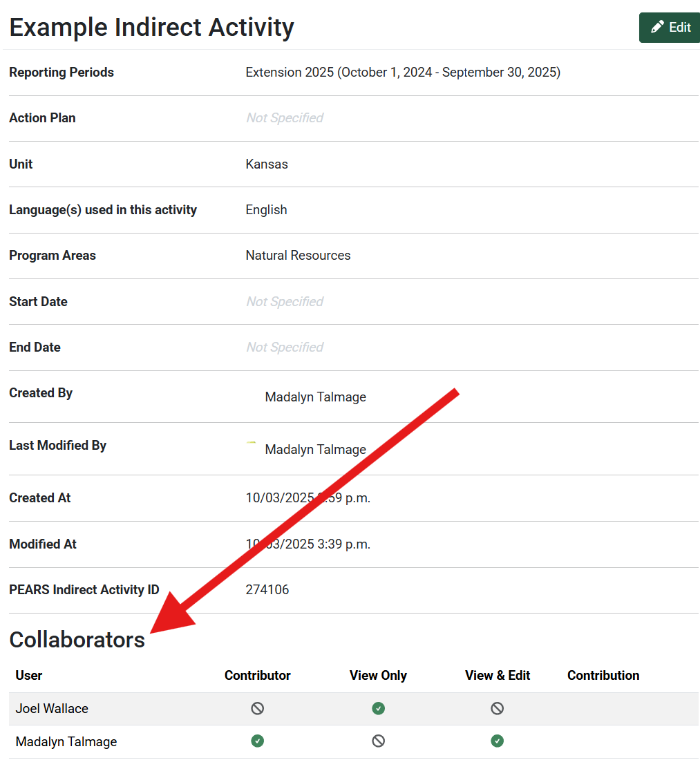 The user that created the record is automatically listed as a collaborator that is also a contributor (involved in performing the work described in the record). This user is automatically given view & edit access. The "Contributor" designation can be removed, if needed.
