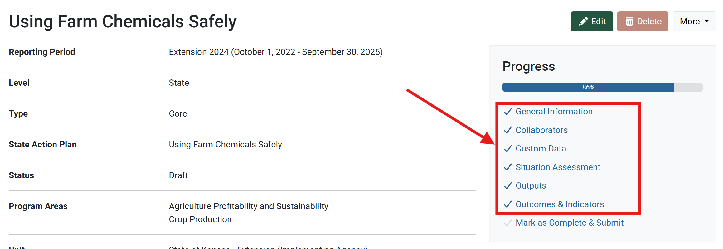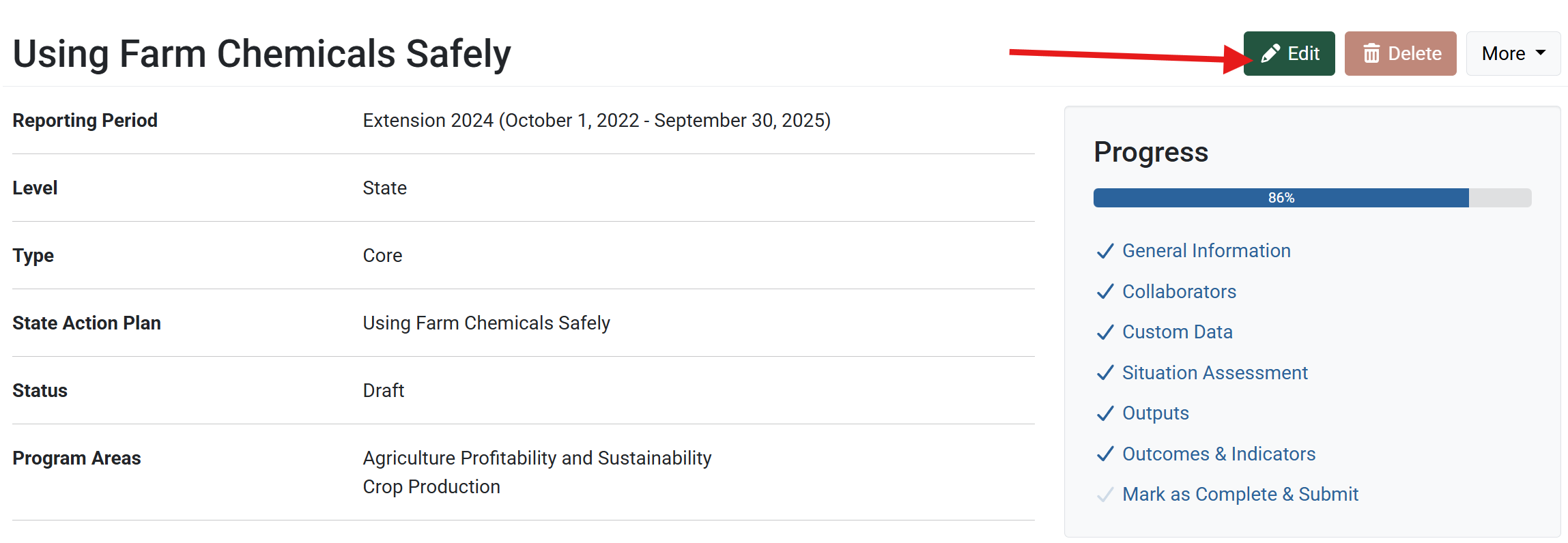 For more information on Action Plan fields, see the documentation article for the applicable section: General Information, Collaborators, Custom Data, Situation Assessment, Outputs, or Outcomes & Indicators. - After making changes, click Save and continue to save the page and move to the next section, or click Save to save the current changes and view the record details.