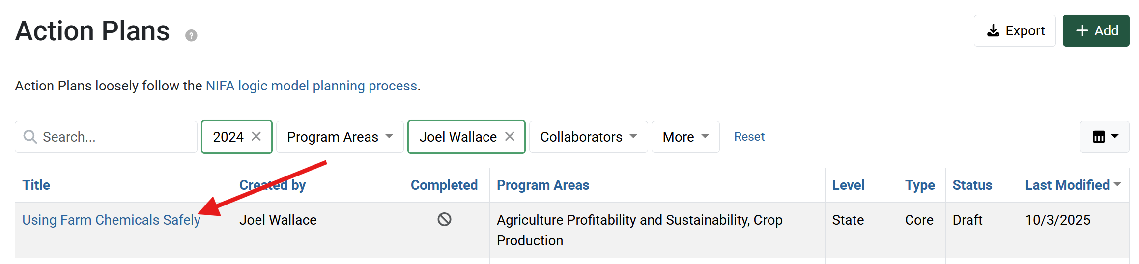 By default, your Action Plan list shows records that you have created in the current reporting year. Click the Filter button to filter for other records.
