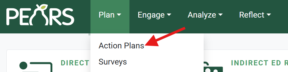 - From the PEARS homepage, hover the cursor over the Plan menu and click on Action Plans: