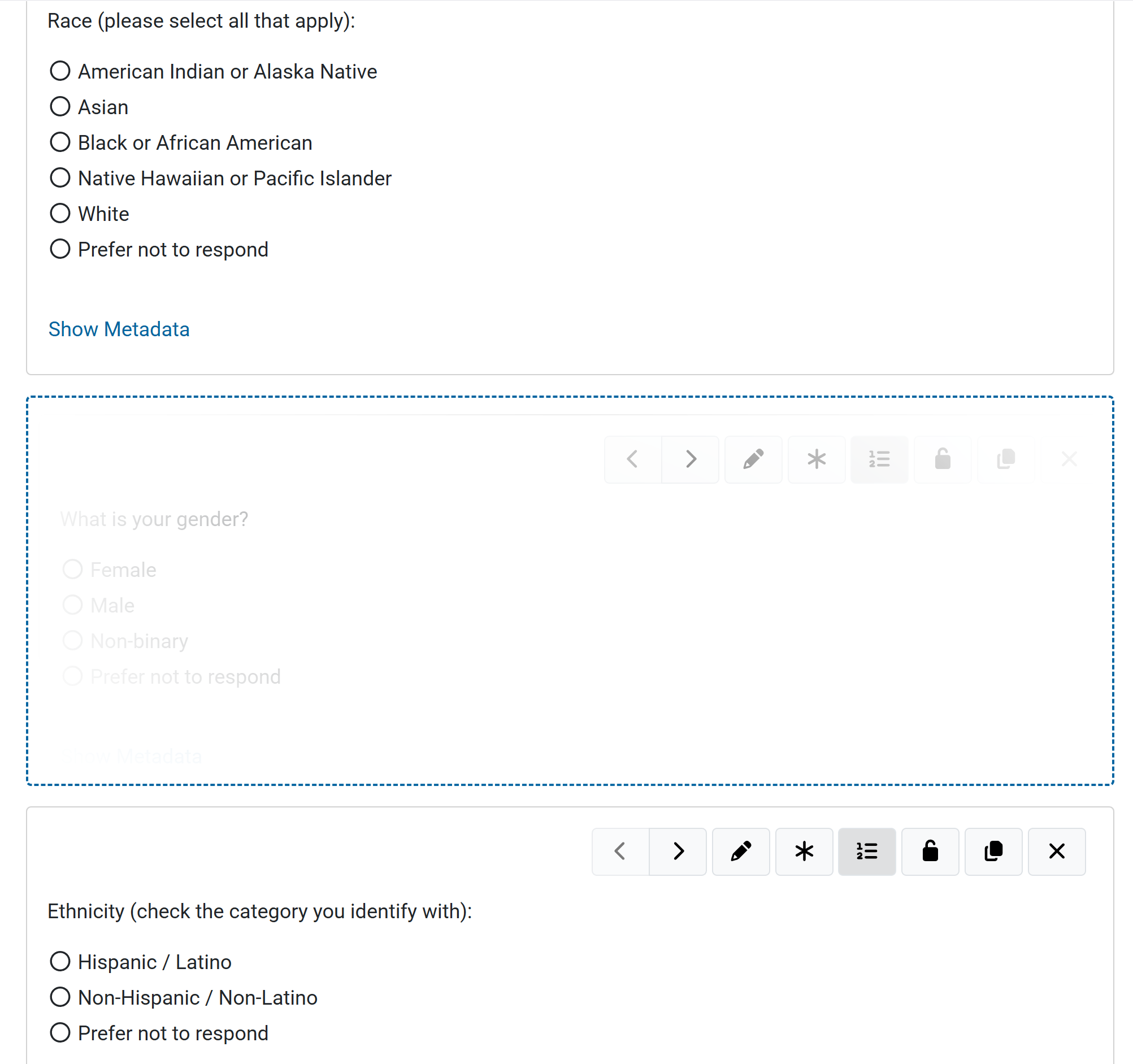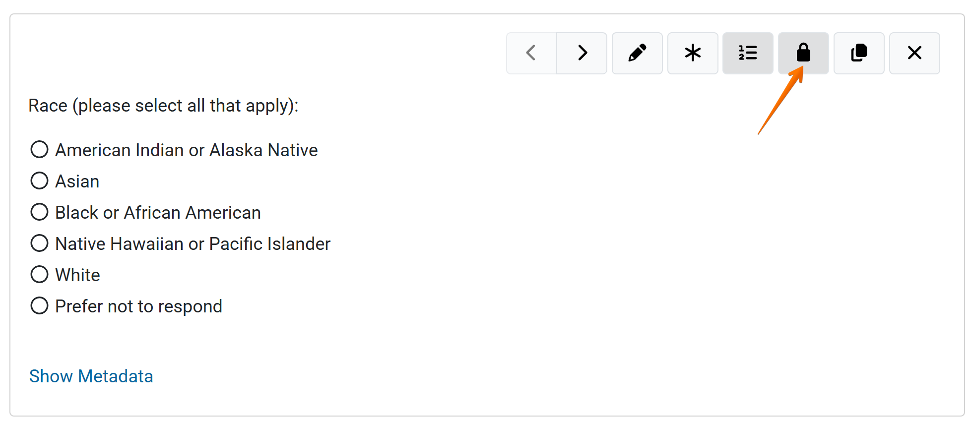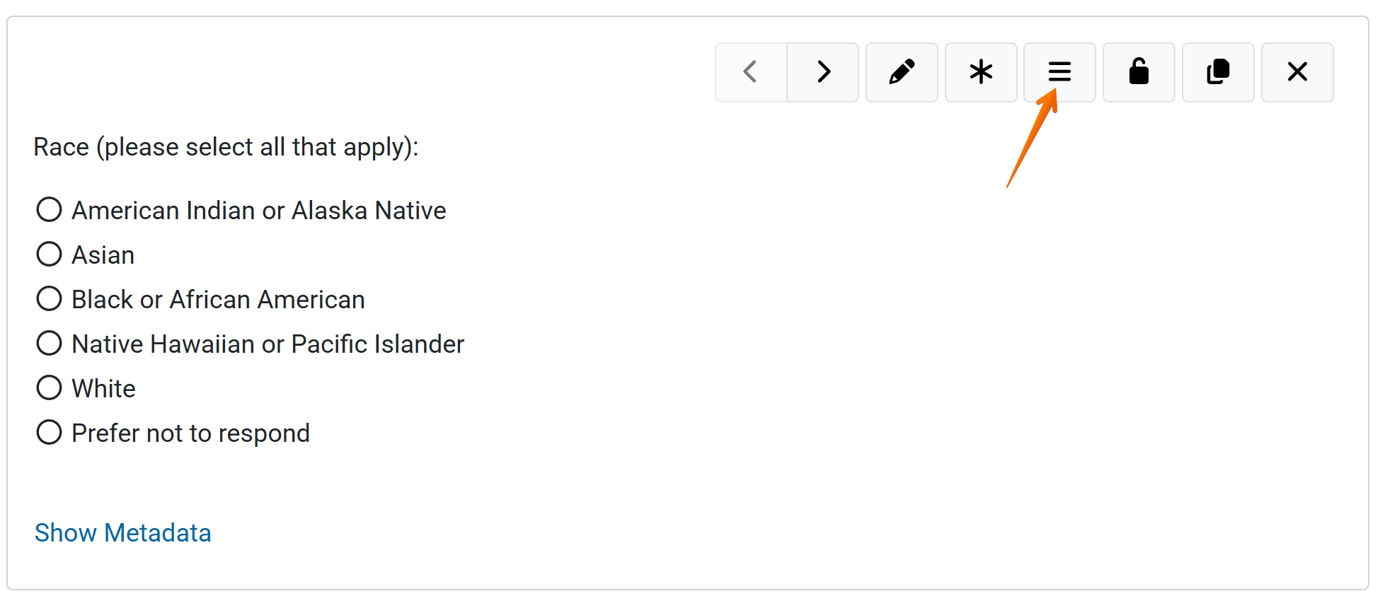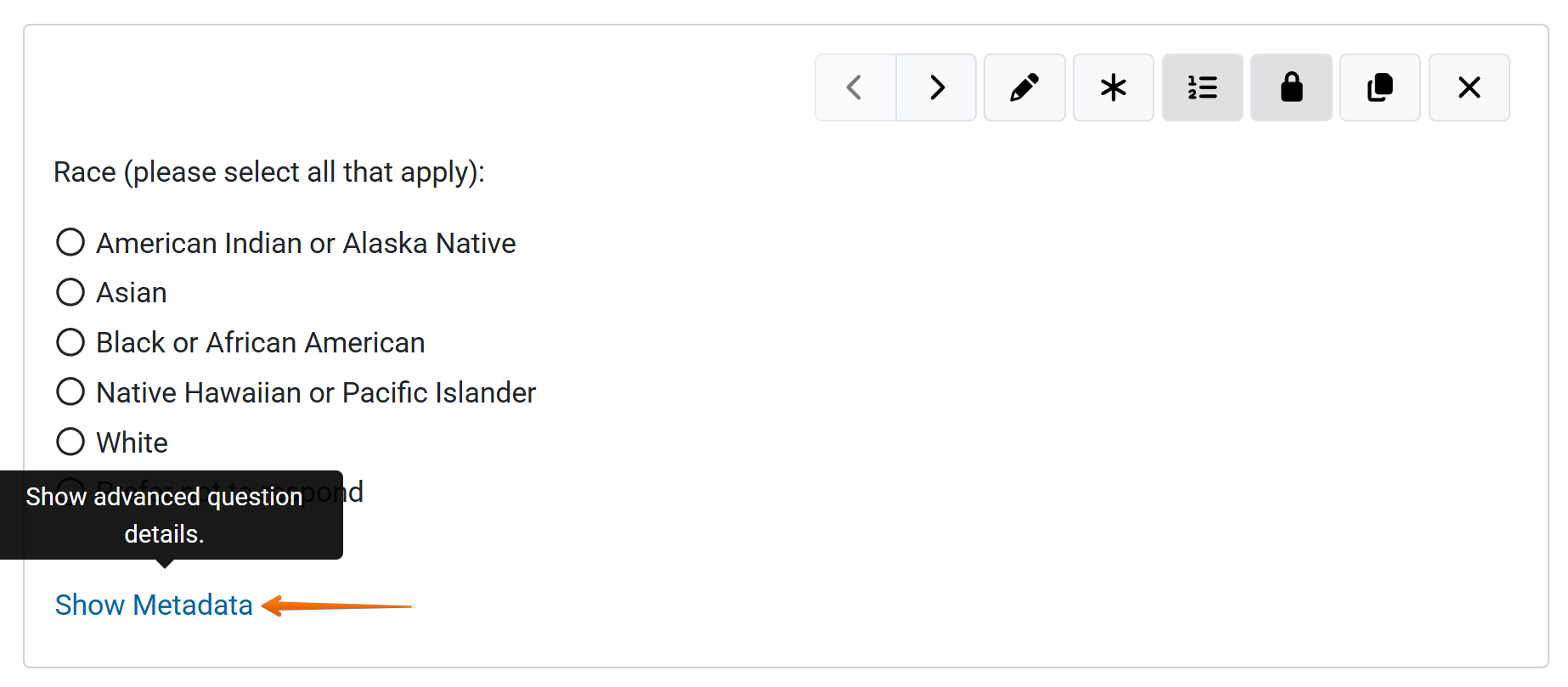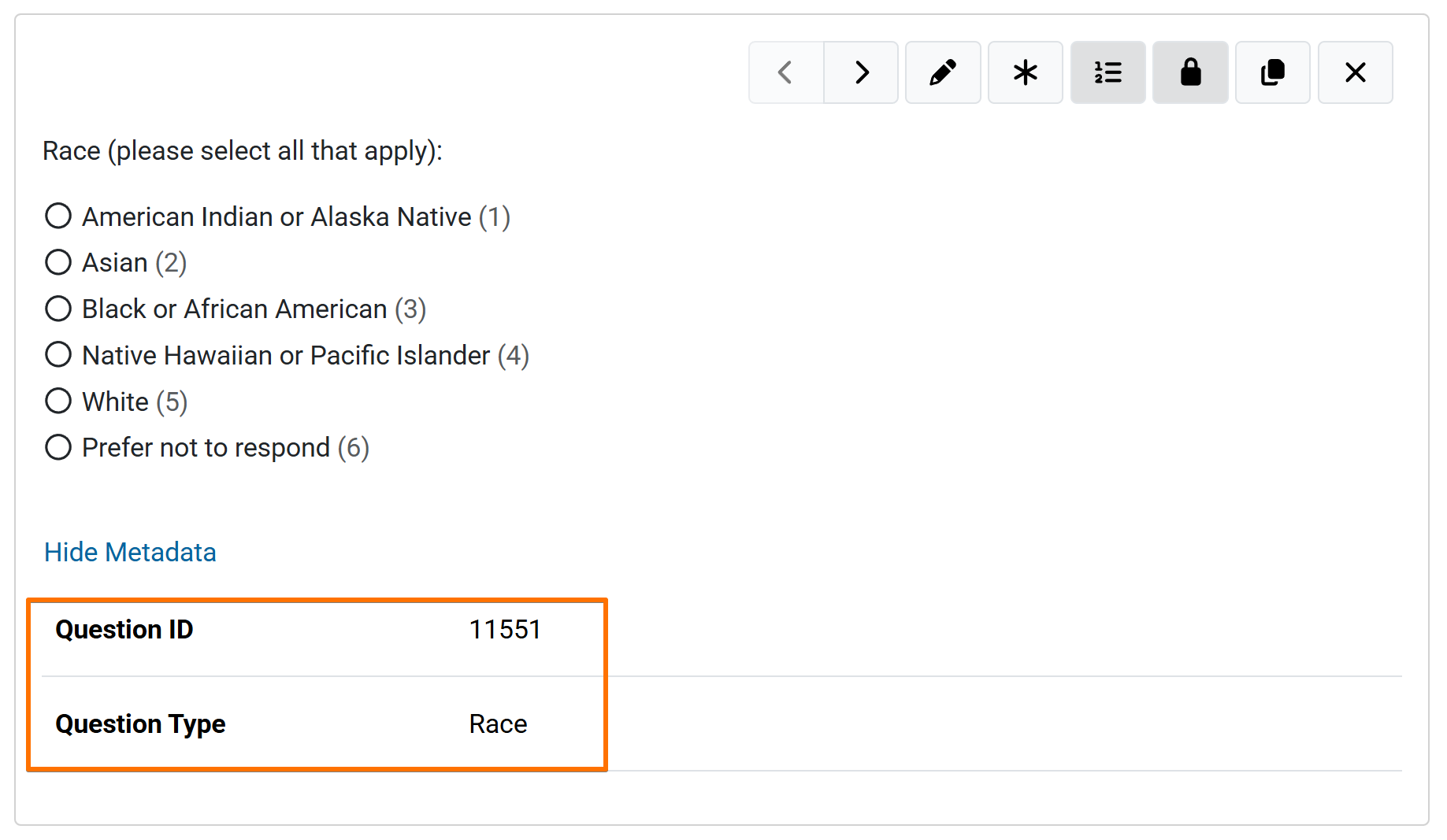 To view the advanced question details (survey metadata), select the ‘Show Metadata’ link. The question ID and Question Type will display.