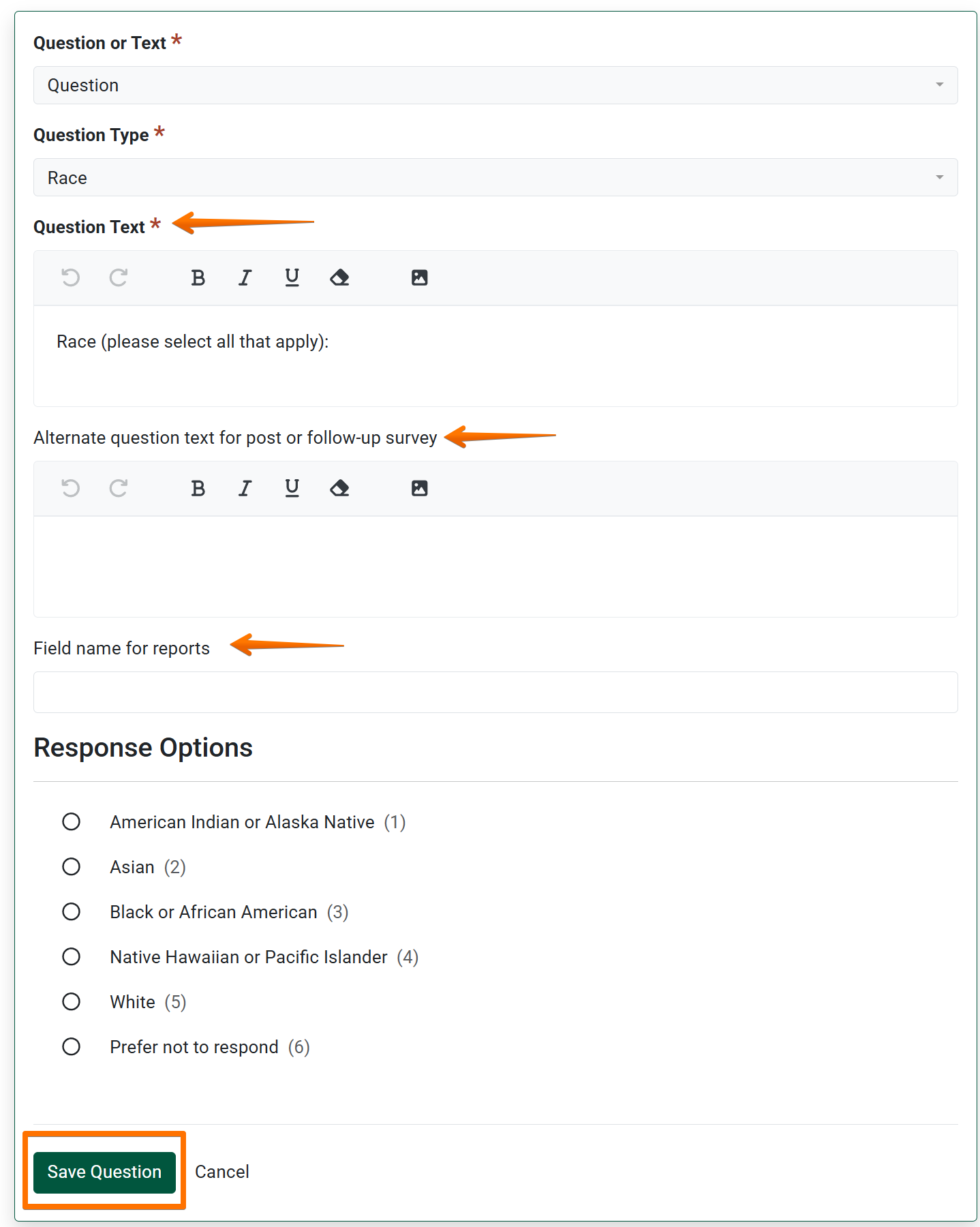 Optionally edit the survey question text, create alternate text for post or follow-up survey, and set a field name for reports when you export the survey response data. Click Save Question once the survey question has been edited.