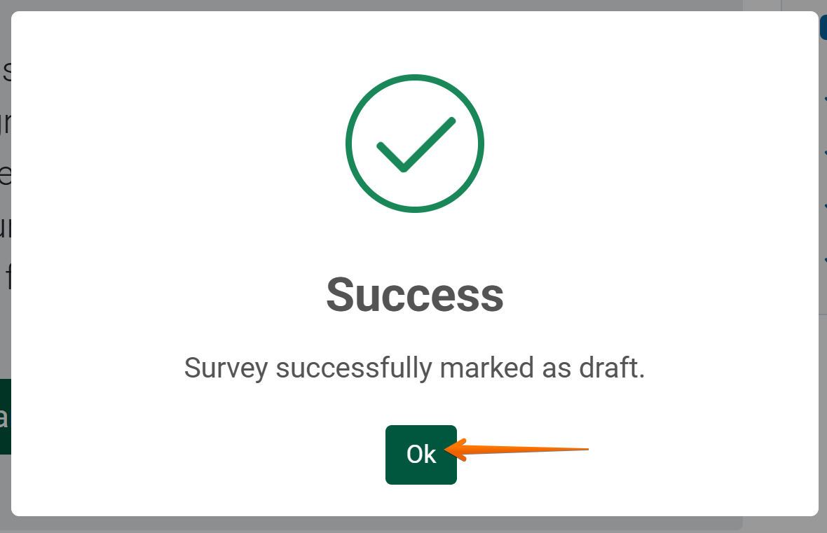 5. The Success message box is displayed. Click the OK button to dismiss the message. The survey may now be edited. Survey successfully marked as a draft.