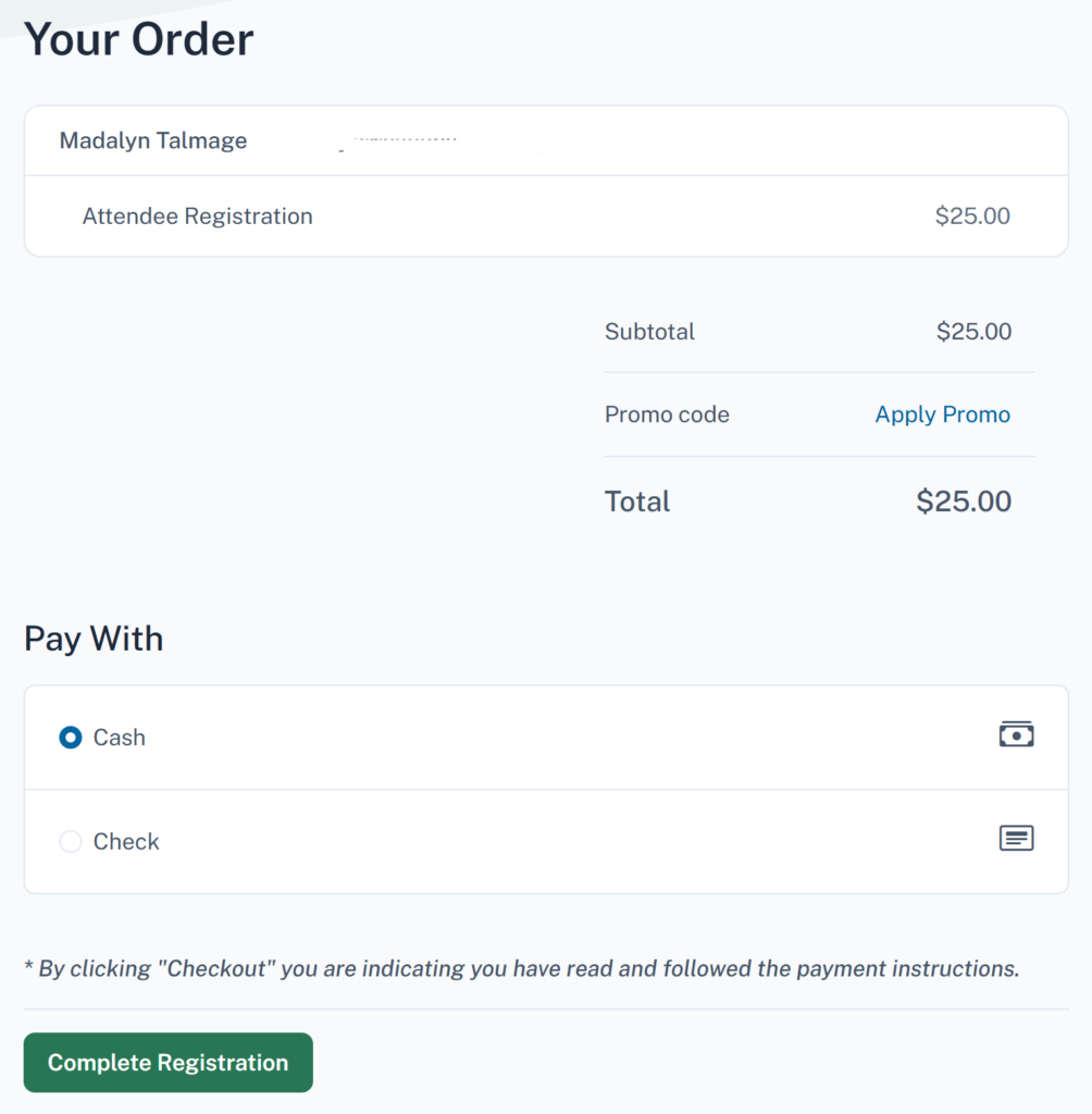 For payment options that are not processed online (e.g. cash or check), the preview payment step works the same way as public registrations. After clicking “Complete Registration”, the confirmation page appears and a confirmation email is sent.