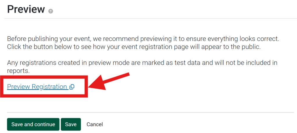 Before publishing an event, we recommend previewing the public-facing details and registration form to ensure everything is set up correctly. More information on previewing is provided below, including:
